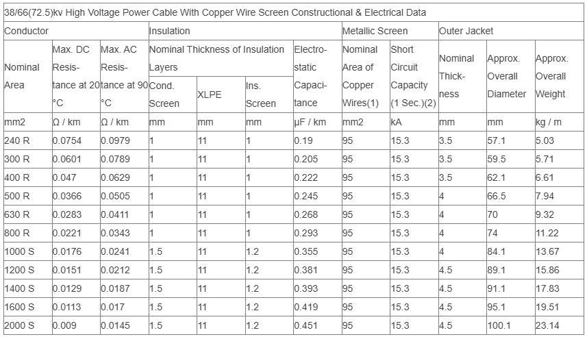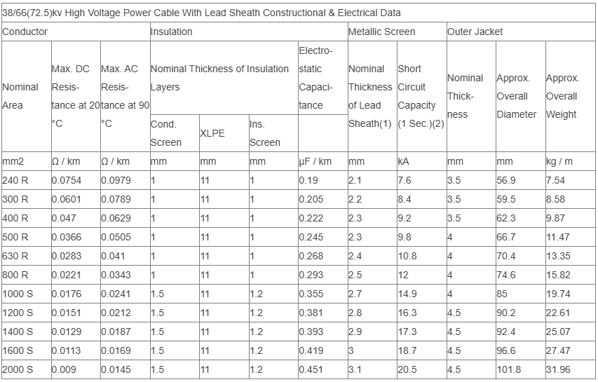 38/66KV XLPE مواصفات كابل الجهد العالي: