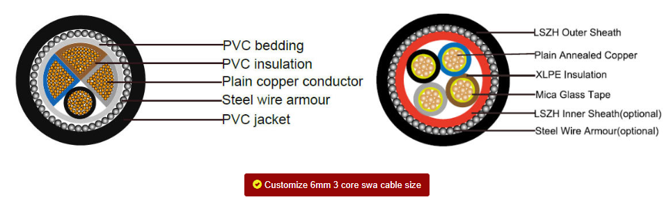 كابل SWA الأساسي 6 مم 3 هو الجهد هو 0.6/1KV. وهي مصنوعة من موصل ، عزل ، جاك الداخلي ، طبقة الدروع والغمد الخارجي. تجلس طبقة درع الأسلاك الفولاذية أسفل غمد الكابل. طبقة الدروع من الكابل المدرع 6 مم 3 مم 3 لتوفير الحماية لطبقات الموصل والعزل. تُعرف الكابلات المدرعة SWA Core 3MM 3 أيضًا باسم الكابلات المدرعة للأسلاك الفولاذية. هو أساسا لتزويد الكهرباء خارجيا أو مدفونة تحت الأرض. على سبيل المثال التثبيت تحت الأرض.